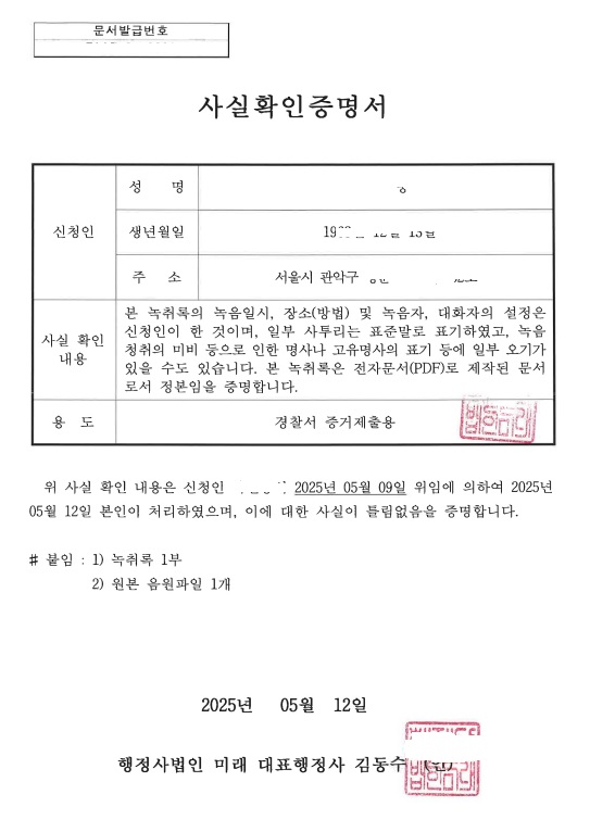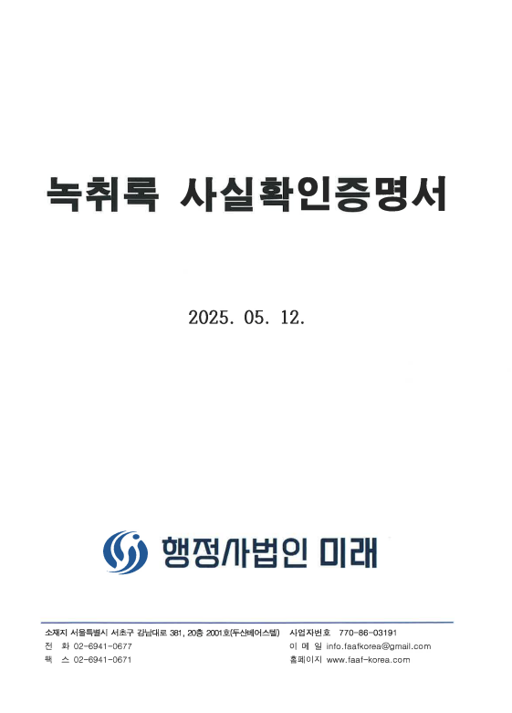 녹취록 작성 및 사실확인증명서 발급 사례 페이지 정보 등록일 25-05-13 08:48 조회 275회 목록 본문 녹취록 작성 및 사실확인증명서 발급 이전글경영혁신형 중소기업(메인비즈) 확인서 26.02.19 목록